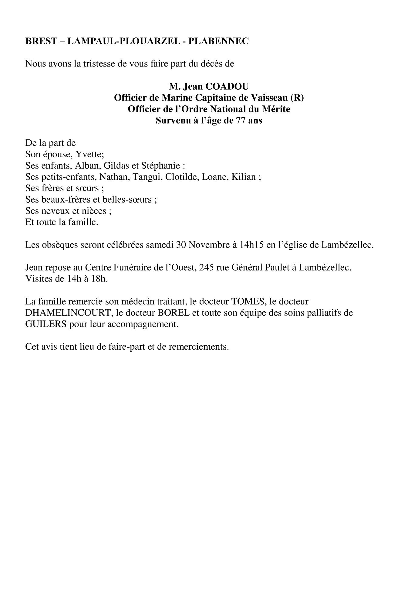 Décédé à Guilers (29820, France) le mercredi 27 novembre 2024 à l'âge de 77 ans