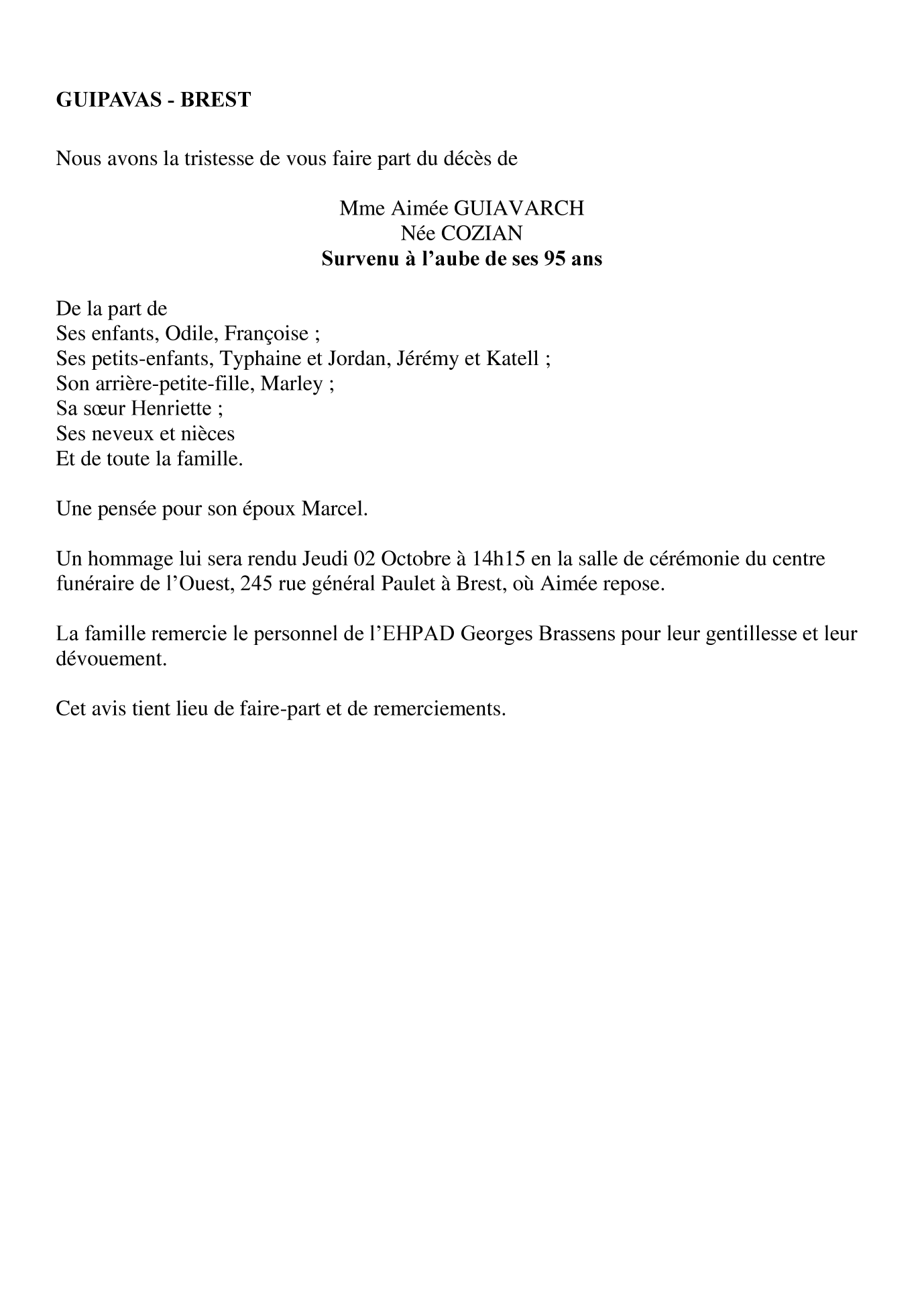 Décédée à Brest (29200, France) le dimanche 28 septembre 2025 à l'âge de 94 ans