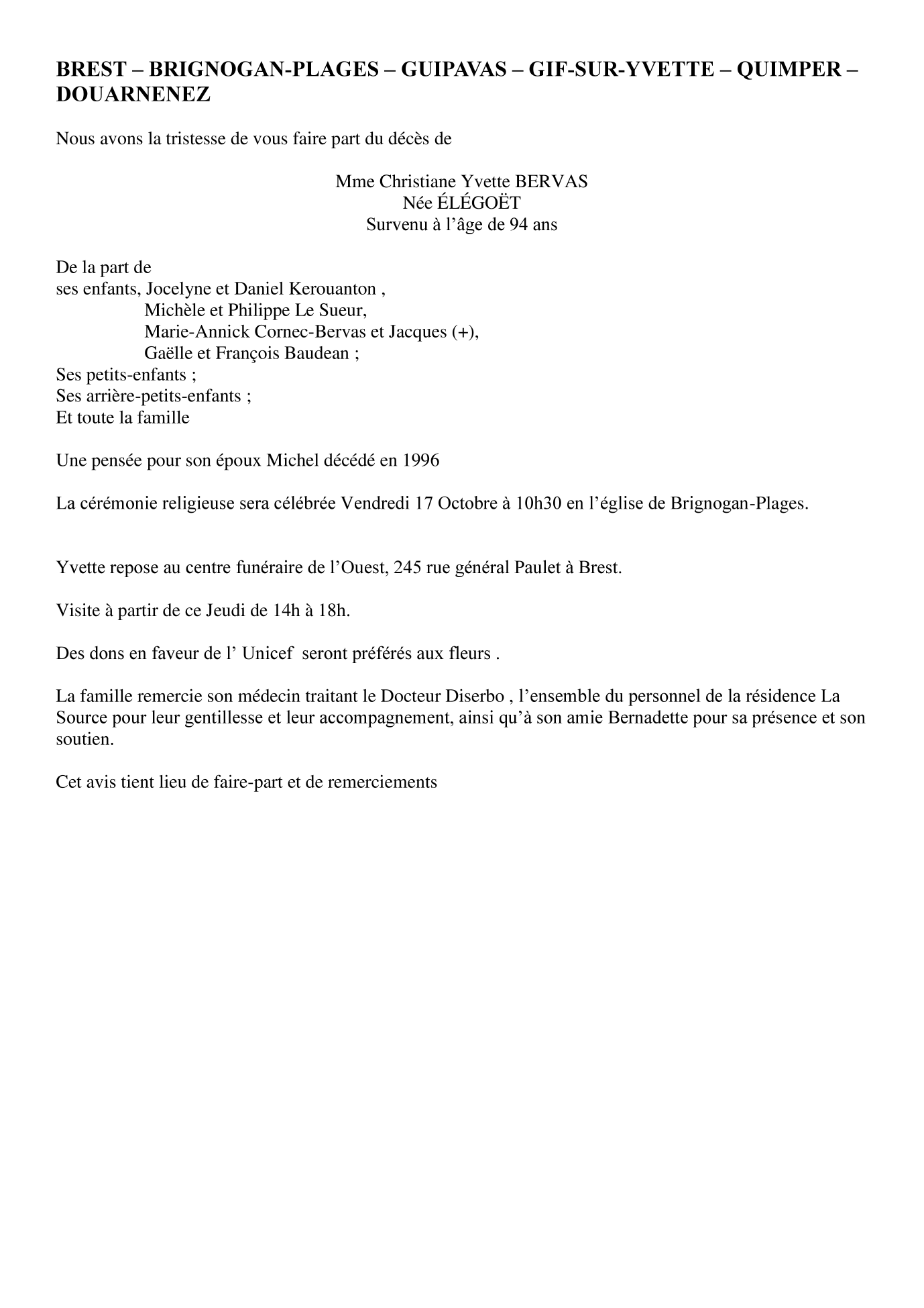 Décédée à Brest (29200, France) le dimanche 12 octobre 2025 à l'âge de 94 ans