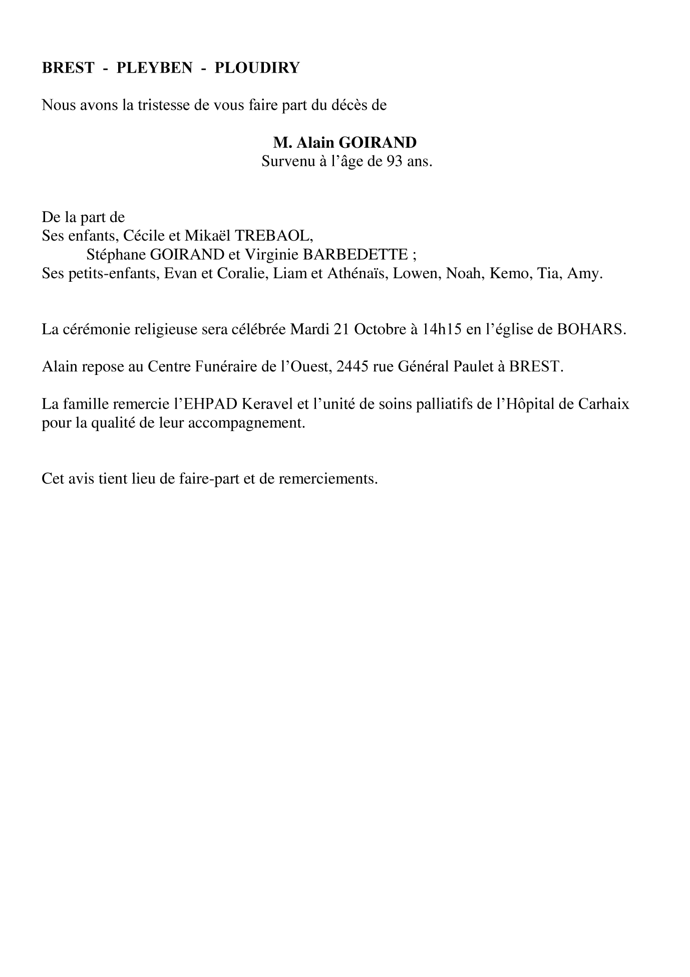 Décédé à Carhaix-Plouguer (29270, France) le jeudi 16 octobre 2025 à l'âge de 93 ans