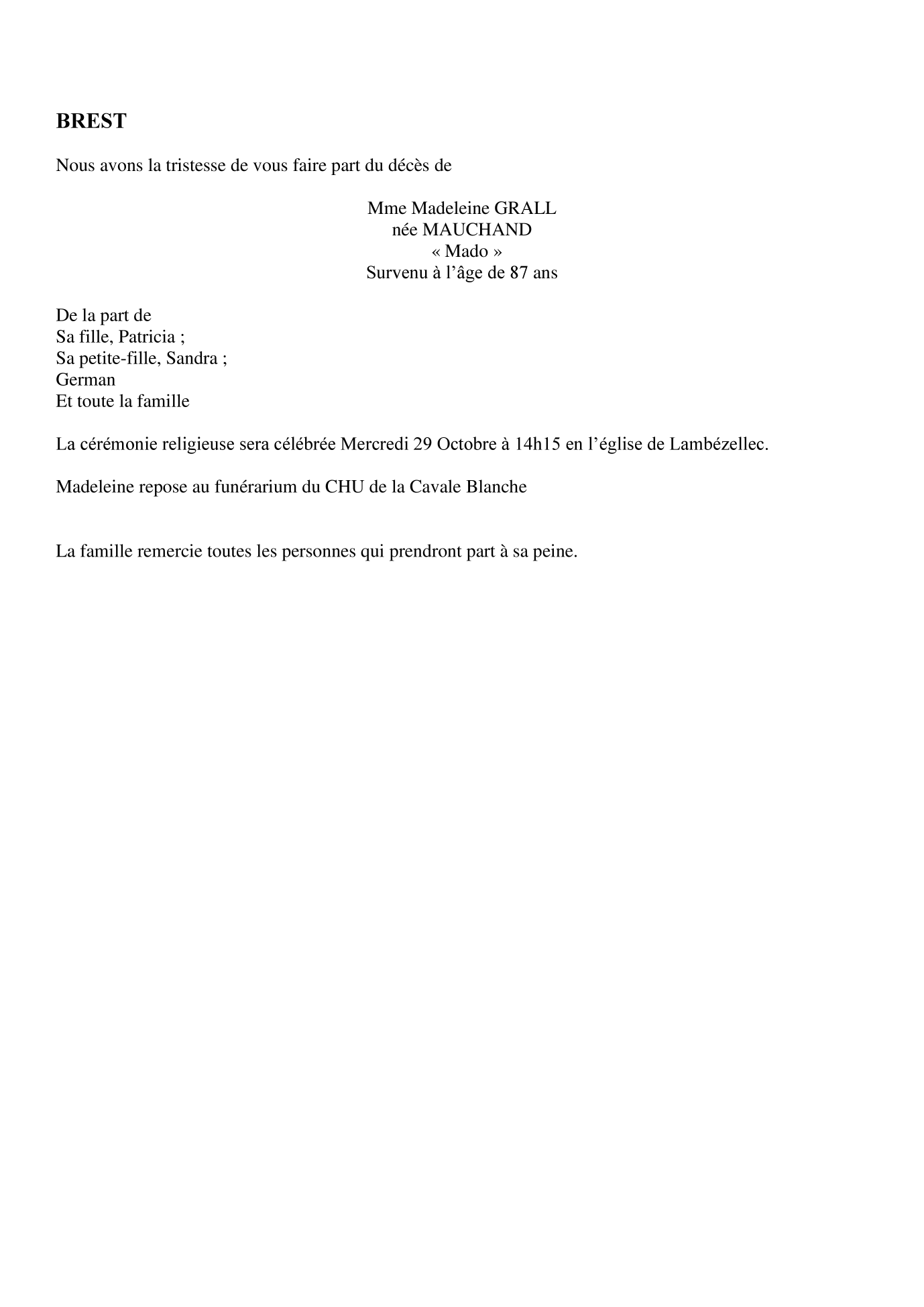 Décédée à Brest (29200, France) le mardi 21 octobre 2025 à l'âge de 87 ans