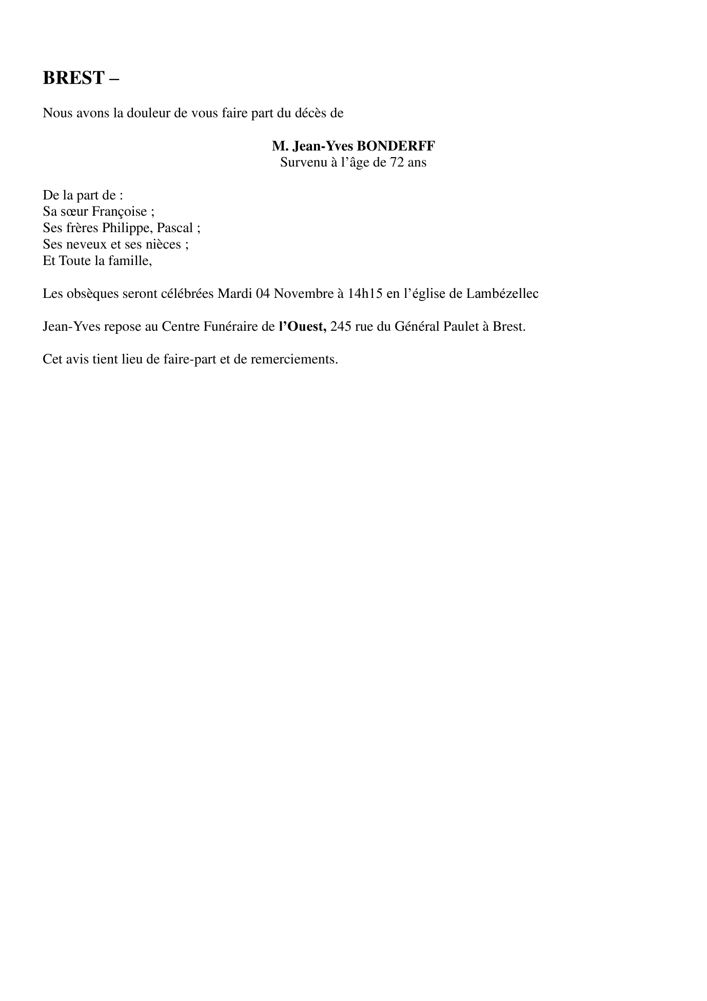 Décédé à Brest (29200, France) le mercredi 29 octobre 2025 à l'âge de 72 ans