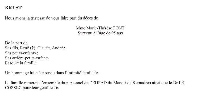 Veuve de Monsieur Joseph PONT