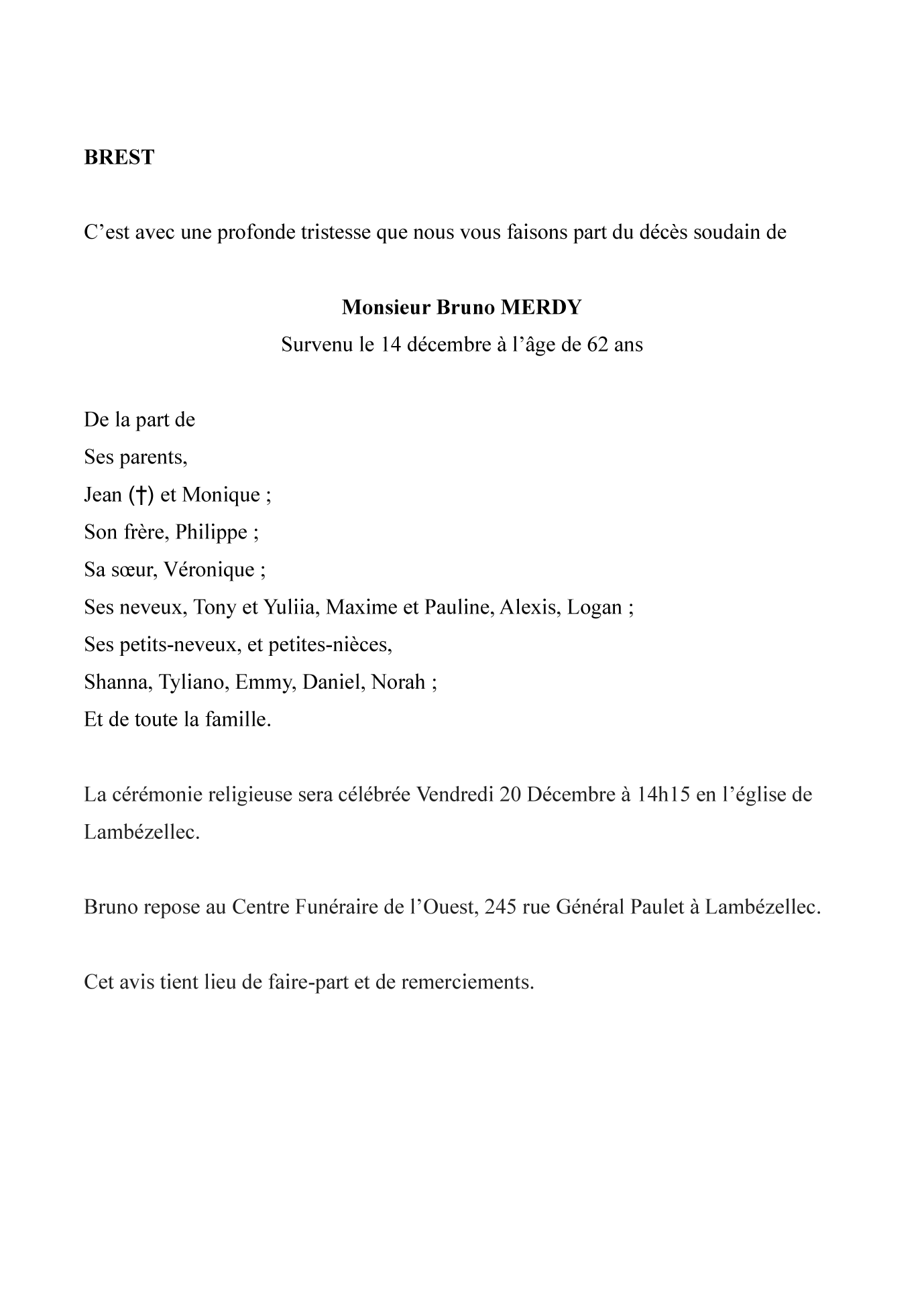 Décédé à Brest (29200, France) le samedi 14 décembre 2024 à l'âge de 62 ans