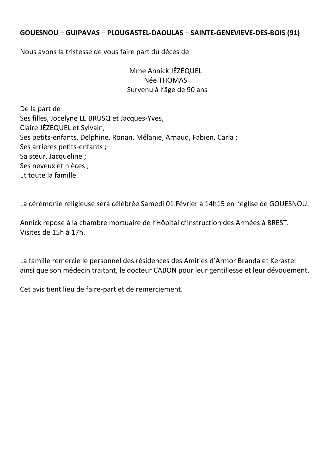 Décédée à Brest (29200, France) le mardi 28 janvier 2025 à l'âge de 90 ans