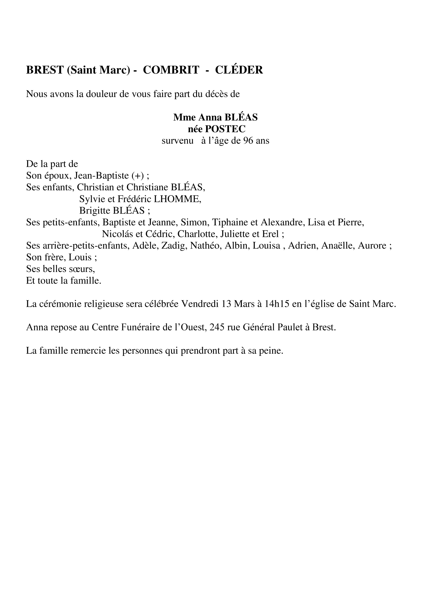 Madame Anna BLEAS née POSTEC